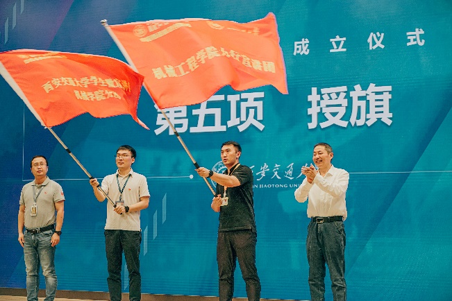 王朝晖、薛周利、苏翔、陈晨共同为力行宣讲团揭牌。陈晨、王朝晖向力行宣讲团负责人杨江坤、必赢626net入口团工委书记苏宇授旗。