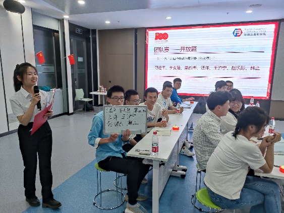 接下来进行了团队挑战赛,通过预赛脱颖而出的8个队伍展开竞答,各支队伍齐心协力积极答题。经过必答题、抢答题、嘉宾抽题环节后比分不相上下,在最后一决高下的开放题环节中,参赛同学们积极讨论,观众们反响热烈,最终由鲁睿、张阮志、王乾三名同学组成的团队“就是懂的多”力拔头筹,获得一等奖。