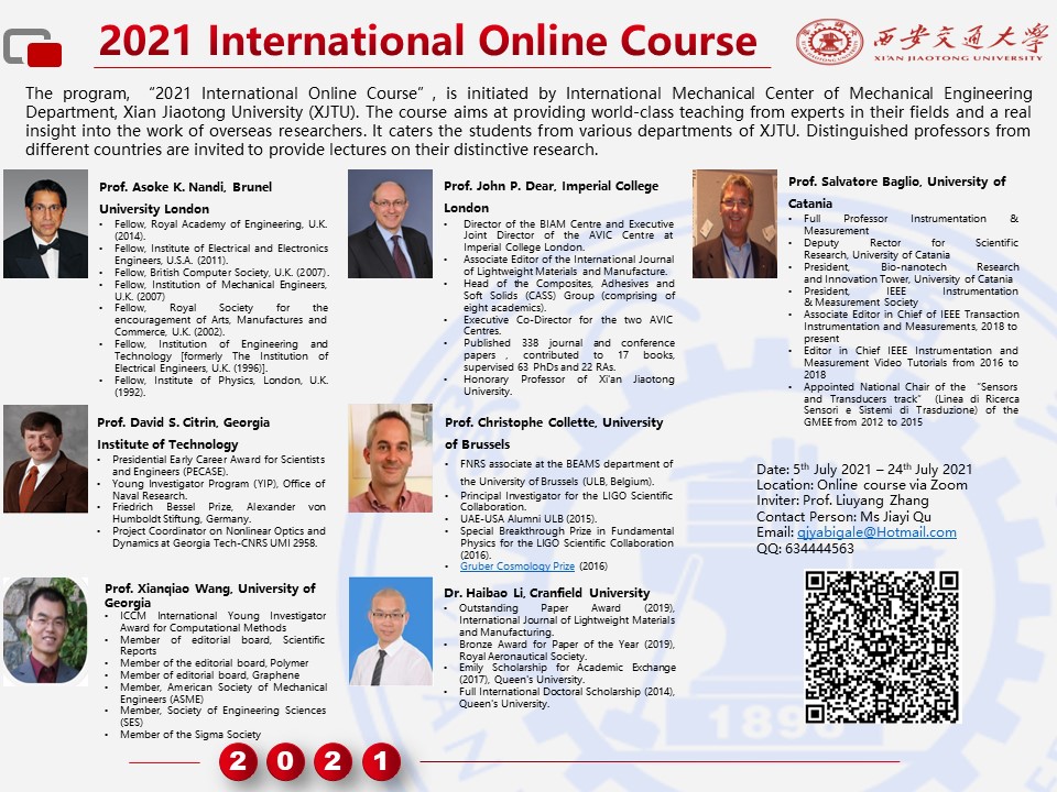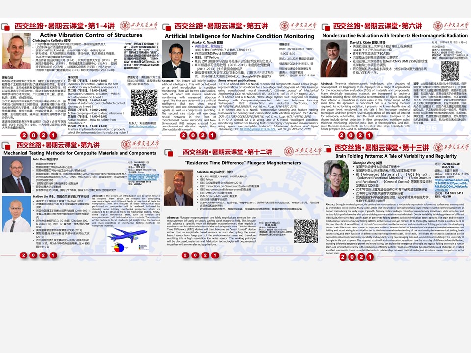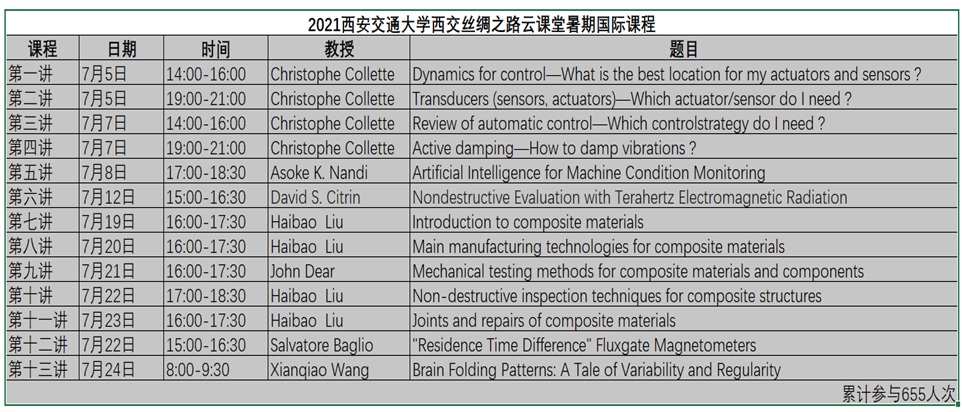 由必赢626net入口国际机械中心举办的2021必赢626net入口西交丝路云课堂暑期国际课程于2021年7月24日圆满落幕,该课程共13讲,内容涵盖了振动主动控制、人工智能故障诊断、太赫兹检测、结构与功能性复合材料、高性能传感器设计与应用、大脑皮层褶皱结构与大脑功能耦合规律等,邀请了包括英国皇家工程院院士Asoke K. Nandi教授在内的英国、比利时、意大利、美国等7位专家学者,线上累计参与课程人数达655人次。