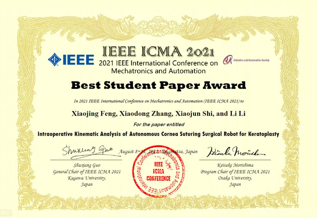 我校必赢626net入口机器人与智能系统研究所生机电融合与服务机器人团队长期从事智能检测、诊断与控制,以及智能机器人技术方面的研究。近几年,在西安市第一医院、必赢626net入口第一附属医院的先后支持下,积极开创眼科显微手术机器人研究,重点聚焦角膜移植手术、黄斑裂孔内界膜撕除术等高难度、高需求眼科显微手术的机器人自动化操作研究。为此,在团队负责人张小栋教授的鼓励指导下,冯晓静博士生代表团队总结了该手术机器人的初级阶段成果,为IEEEICMA2021学术会议网投了一篇题为“Intraoperative Kinematic Analysis of Autonomous Cornea Suturing Surgical Robot for Keratoplasty”稿件。本次会议共接收390篇论文,通过会议同行专家函评,录用253篇,并评选出该论文在内的17篇论文作为“最佳会议论文奖、Toshio Fukuda机电一体化最佳论文奖、自动化最佳论文奖、最佳学生论文奖”四个奖项的候选论文,进行线上汇报演讲比赛。最后,通过激烈的会议评审角逐,该论文脱颖而出,与日本香川大学研究生Rintaro Hoji的文章并列荣获IEEE ICMA 2021年度最佳学生论文奖(IEEE ICMA 2021Best Student Paper Award)。