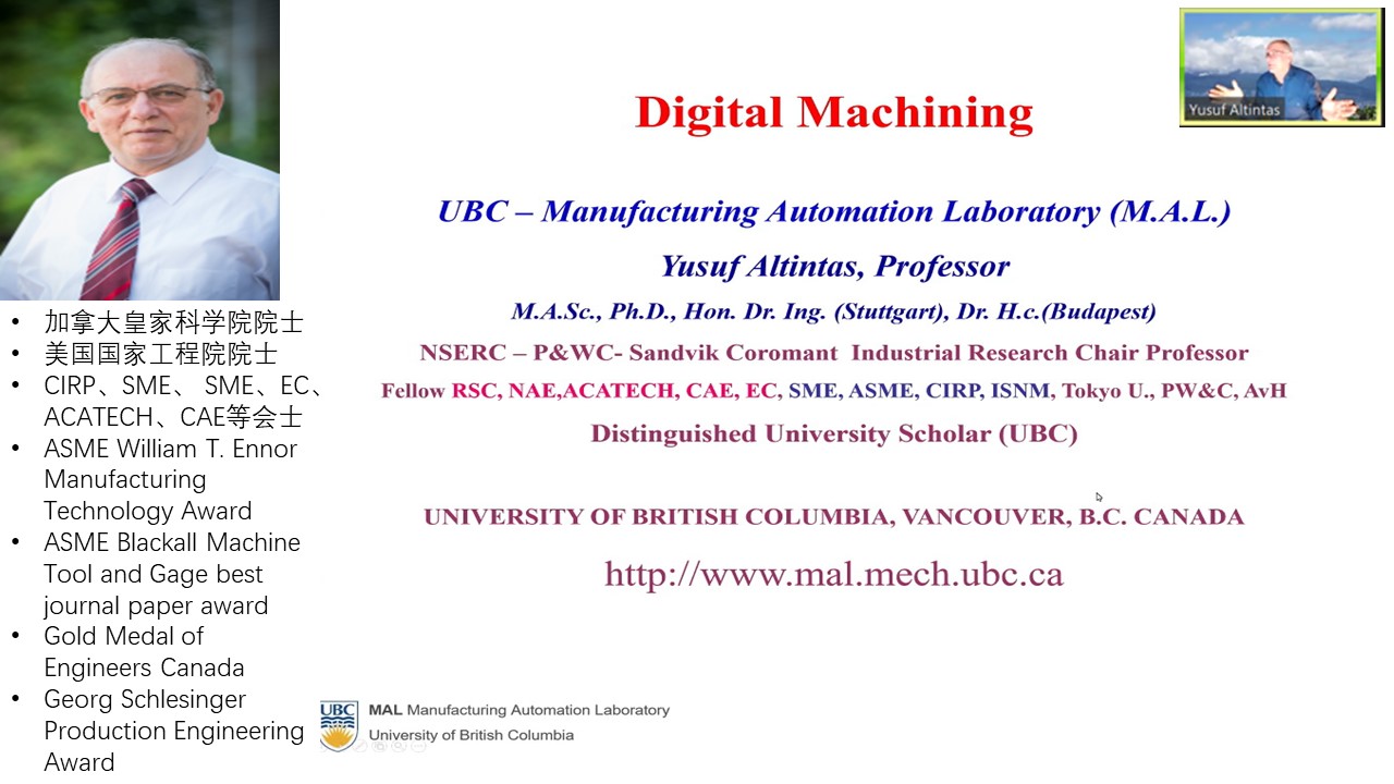 Yusuf Altintas教授做了题为“Digital Machining“学术报告,系统性地介绍了金属切削过程、机床振动控制的数字化模型等方面的基础研究工作,实现了加工机床的数字化设计和加工过程的仿真、优化和在线监测,并在工业上取得了示范性的应用。