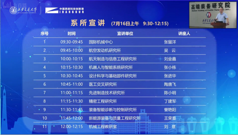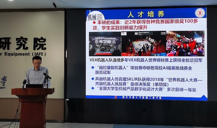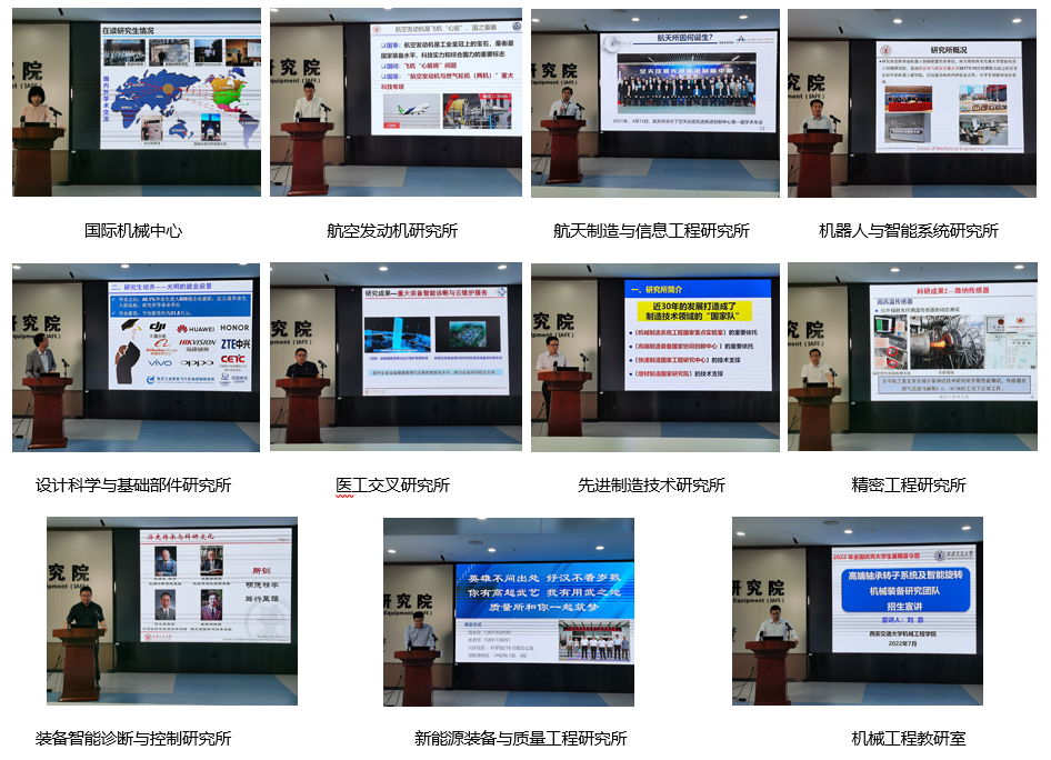 随后,国际机械中心孙瑜副教授、航空发动机研究所所长吴云教授、航天制造与信息工程研究所所长刘金鑫教授、机器人与智能系统研究所副所长张小栋教授、设计科学与基础部件研究所张进华教授、医工交叉研究所唐陶飞副教授、先进制造技术研究所陈小明教授、精密工程研究所丁建军教授、装备智能诊断与控制研究所訾艳阳教授、新能源装备与质量工程研究所王荣喜副研究员、机械工程教研室刘意副教授分别作了精彩的系所宣讲,向同学们详细介绍了各研究所的专业特色、科研成果、师资力量、学生培养等情况,分享了科研工作的感悟,进一步帮助同学们开阔学术视野、了解学术前沿、厚植科研热情。