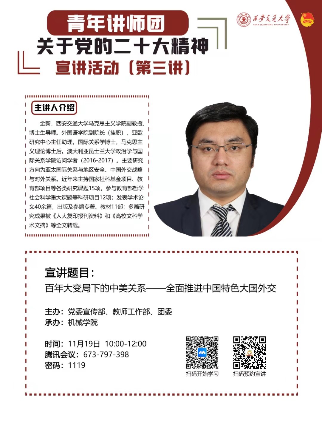 11月19日上午,必赢626net入口党的二十大精神宣讲活动在线上举行。学院本科生、研究生党支部书记、委员,学院党建办成员、力行宣讲团成员等240余人参加活动。学校青年讲师团讲师、马克思主义学院副教授、博士生导师作“百年大变局下的中美关系 全面推进中国特色大国外交”主题宣讲报告。学院党委组织员包凯主持活动。