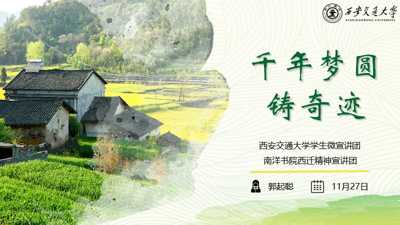 郭起聪首先通过一组数据展示了脱贫攻坚的伟大成就,指出彪炳史册的奇迹的背后是精神的力量。她结合交大人在平利县精准扶贫的故事,带领大家学习了“上下同心、尽锐出战、精准务实、开拓创新、攻坚克难、不负人民”的精神。最后,她鼓励大家从新时代西迁精神、脱贫攻坚精神中汲取力量,在祖国最需要的地方建功立业。