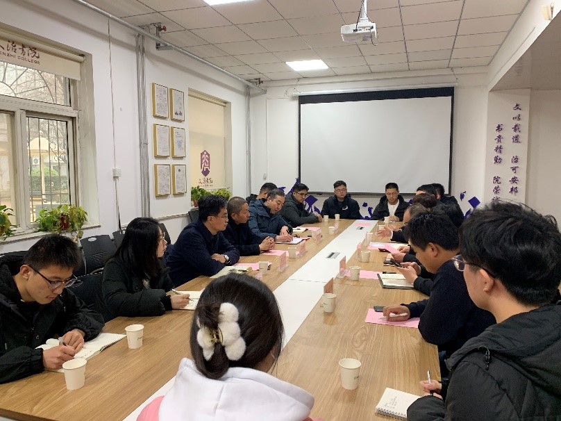 2月22日,必赢626net入口党委书记王朝晖、副院长段玉岗、院长助理王永泉、组织员包凯、教务员李想一行走访钱学森书院、彭康书院和文治书院,与书院辅导员就“双院协同育人工作”“辅导员职业发展”等方面进行交流。走访结束后,必赢626net入口联合钱学森书院、彭康书院和文治书院召开本科生代表座谈会,彭康书院院务主任叶明、钱学森书院院务主任田博、彭康书院院务主任助理朱宏伟、相关辅导员老师,学生党员代表、学生干部代表、毕业生代表等8名同学参加座谈。座谈会由文治书院院务主任王琦主持。