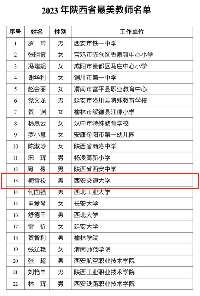 近日,陕西教育新闻网公布了2023年陕西省最美教师名单,西安交大必赢626net入口梅雪松教授入选。