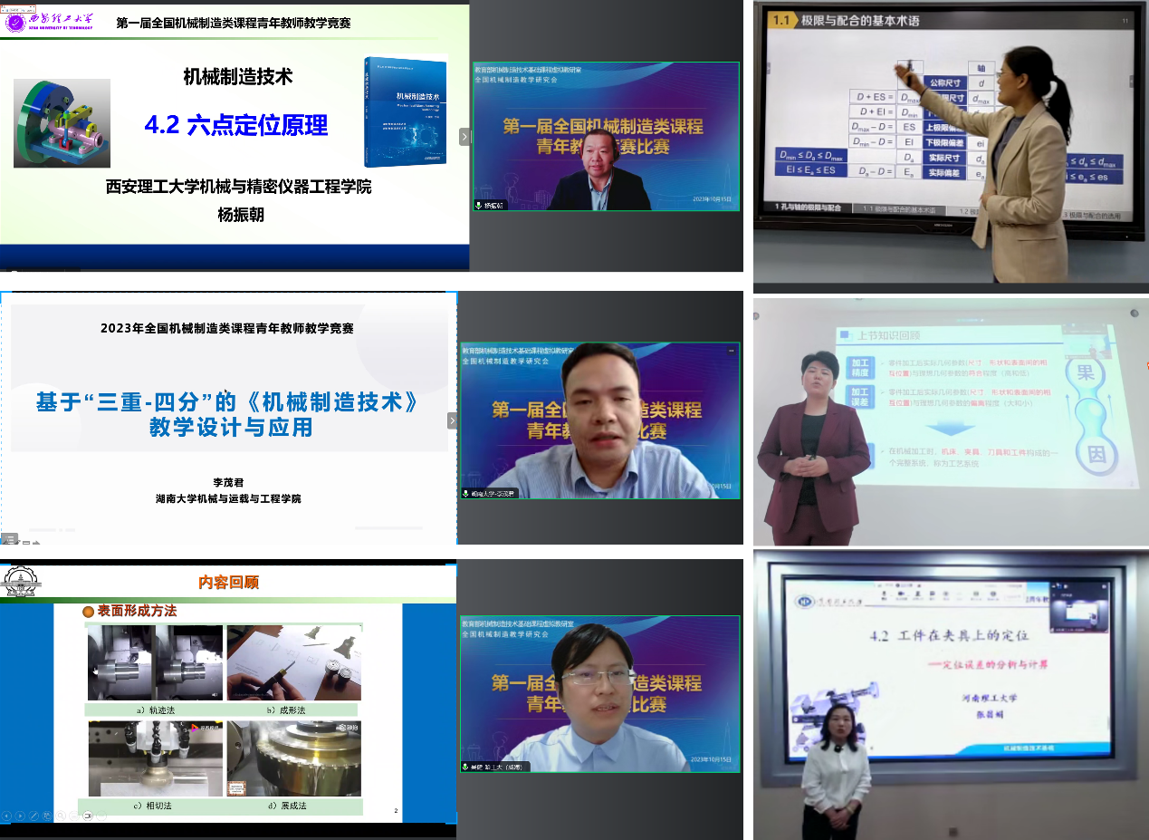 报名参赛的青年教师按授课内容分成两组展开,第一组授课内容集中在机械加工方法、机床性能与精度、金属切削原理与刀具,第二组则围绕工艺性分析、尺寸链、夹具、六点定位原理与定位误差展开讲授。视频直播、PPT共享演示等多种形式贯穿于比赛之中,来自全国10所高校的机械制造技术基础课程资深教授、国家一流课程负责人从教学设计、内容授课及教学形式等环节对各位参赛选手进行了评定。