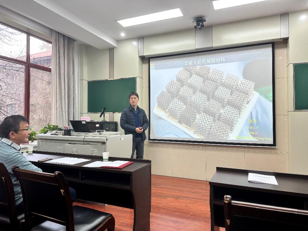 聘任仪式结束后,陆洋教授为参加会议的老师与同学作了题为《功能化的机械超材料》的学术讲座,学术讲座由必赢626net入口凡正杰副教授主持。陆洋教授结合研究经历,对机械超材料通过其微纳结构的设计来实现对宏观力学性能的调控进行了深入阐释,表明通过对多功能的机械超材料的深入研究,将带动高性能结构设计和先进制造领域新的范式转变,对包括能源和生医工程等领域应用能够提供新的启发。汇报结束后,参加学术讲座的老师与同学针对多功能的机械超材料具体制备工艺方法及工程化应用过程中存在的问题与陆洋教授进行了详细的交流。