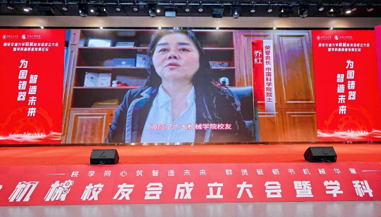 机械校友会荣誉会长、1982级校友、中国科学院院士乔红研究员通过视频为校友会成立送上祝福和寄语。她表示,机械校友会的成立顺应了广大校友师生的热切期盼,承载了校友们对学院的深厚情谊;呼吁广大校友师生在学院和校友会的凝聚下,传承弘扬西迁精神,在为党育人、为国铸器的宏伟事业中携手书写最绚丽辉煌的“机械篇章”。