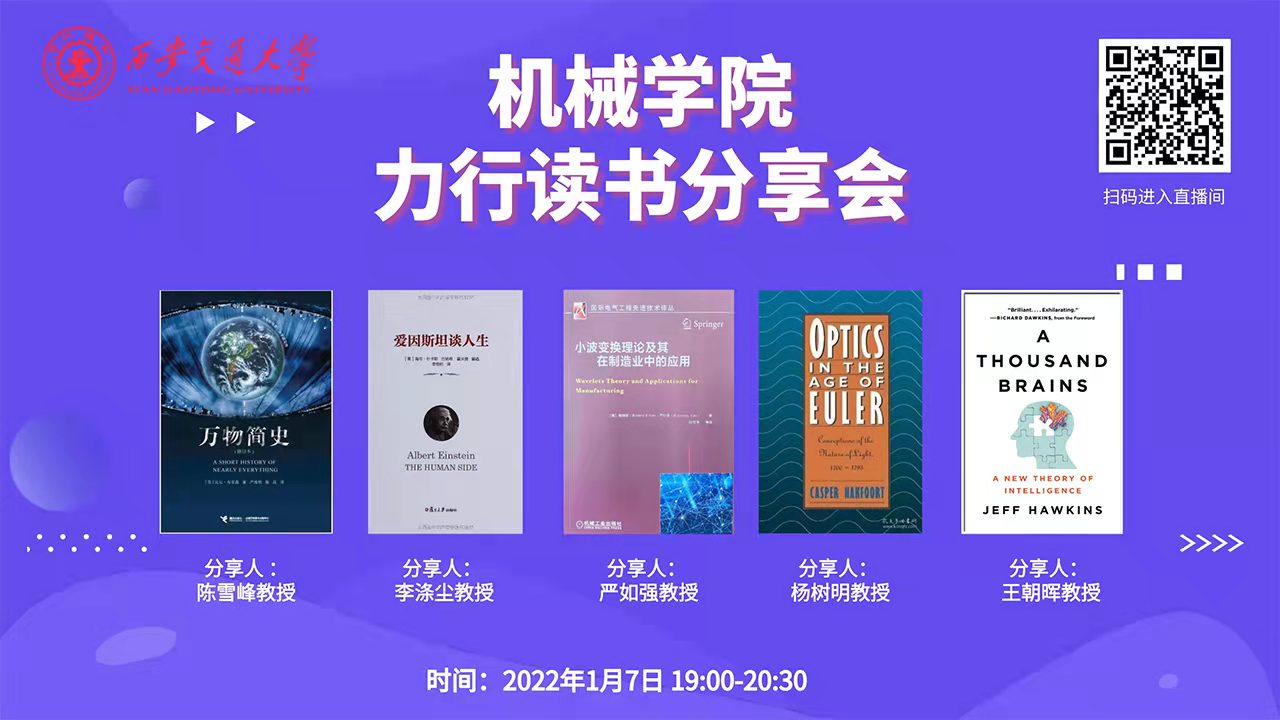 为了丰富必赢626net入口师生的疫情期间生活,提高思想水平和科研动力,坚定抗击疫情的信心,1月7日晚,必赢626net入口以线上直播的方式在必赢626net入口思源直播平台开展了必赢626net入口力行读书分享会。本次分享会邀请了必赢626net入口党委书记王朝晖教授、院长陈雪峰教授、副院长杨树明教授、国际机械中心主任严如强教授和机械制造系统工程国家重点实验室主任李涤尘教授开展读书分享活动,党委副书记张敏主持本次分享会,必赢626net入口的本科生以及研究生共3800余人次在线上观看直播学习。本次读书分享会涉及不同领域的精选好书,包括文化、历史、科学以及聚焦专业知识等方面,同时也包含中文书目的分享以及英文书目的分享,内容十分充实。