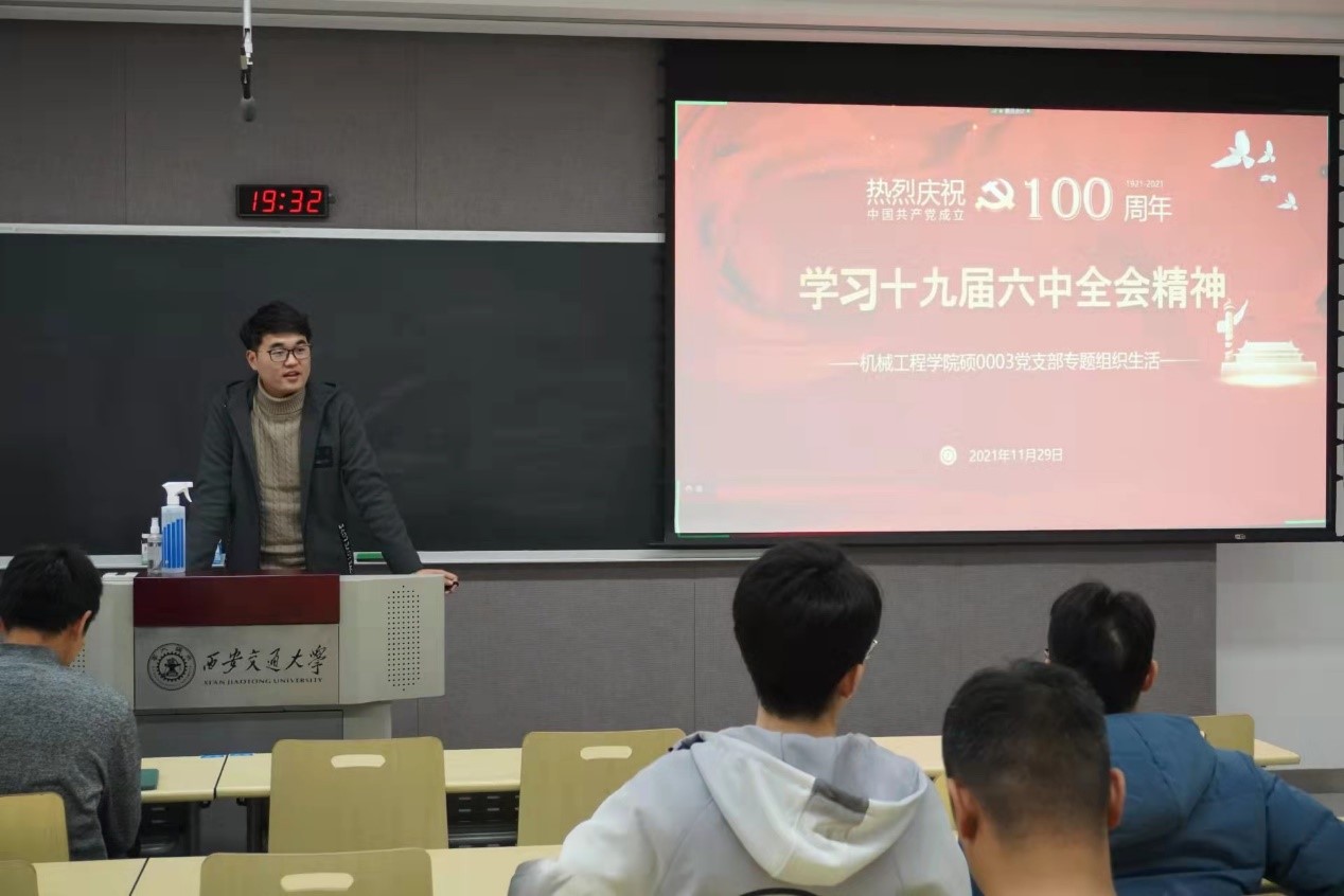 分享结束后,其他同志们纷纷要求发表自己对十九届六中全会的精神感悟。樊盼盼同志结合我们的研究生科研任务,讲述了自己对党百年伟大奋斗的感触,表达了自己投身科研事业,为社会主义现代化建设积极奋斗的志向。殷伟、祁朋园和尚国栋结合自身的成长生活经历,讲述了自己二十余年人生经历中,亲历的社会发展成就,表达了对党百年伟大奋斗的由衷赞叹,并对第二个百年奋斗目标作了展望。支部书记李希晨同志对组织生活作了总结发言。