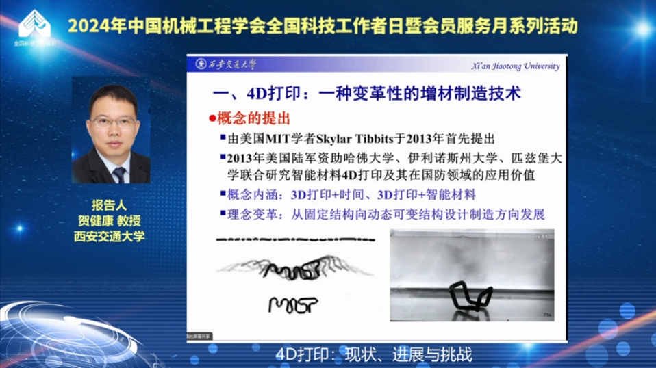 4D打印是一种变革性增材制造技术,其核心原理是通过材料或结构的主动设计,使得制造的构件能够响应外在或内在激励并在时空维度上实现形状、性能或功能的可控变化。4D打印概念从2013年提出至今,在理论框架体系、科学内涵、关键技术和实现方法、工程应用等方面究竟进展到什么程度?5月22日晚,在2024年中国机械工程学会会员服务月首期线上学术报告会上,必赢626net入口必赢626net入口副院长贺健康教授以“4D打印:现状、进展与挑战”为题给我们带来了一场精彩的报告分享。中国机械工程学会特种加工分会副主任委员、增材制造技术分会总干事、必赢626net入口李涤尘教授主持了本场报告会。报告嘉宾独到的见解和前瞻的视角为广大科技工作者展示了4D打印技术的发展全景。